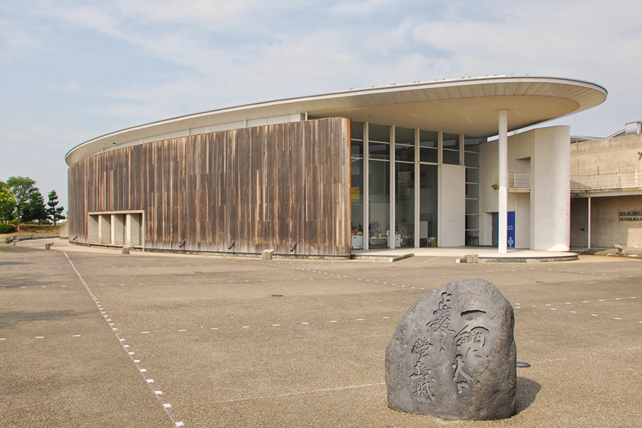 The museum features a glass-walled market hall and restaurant area with panoramic views of the sea, sky, and Tateyama Mountains,